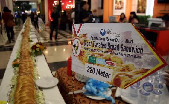 Giant Twisted Bread Sandwich yang memiliki panjang 228 meter 97 sentimete dengan lebar 15 sentimeter dan memiliki ketebalan 8 sentimeter tersebut dibuat selama 3 hari oleh 20 Chef.