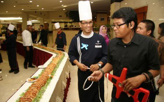 Setelah dipajang di atas meja, sekitar pukul 12.30 WIB beberapa orang dari Muri mulai melakukan pengukuran akan panjang dari roti sandwich tersebut.